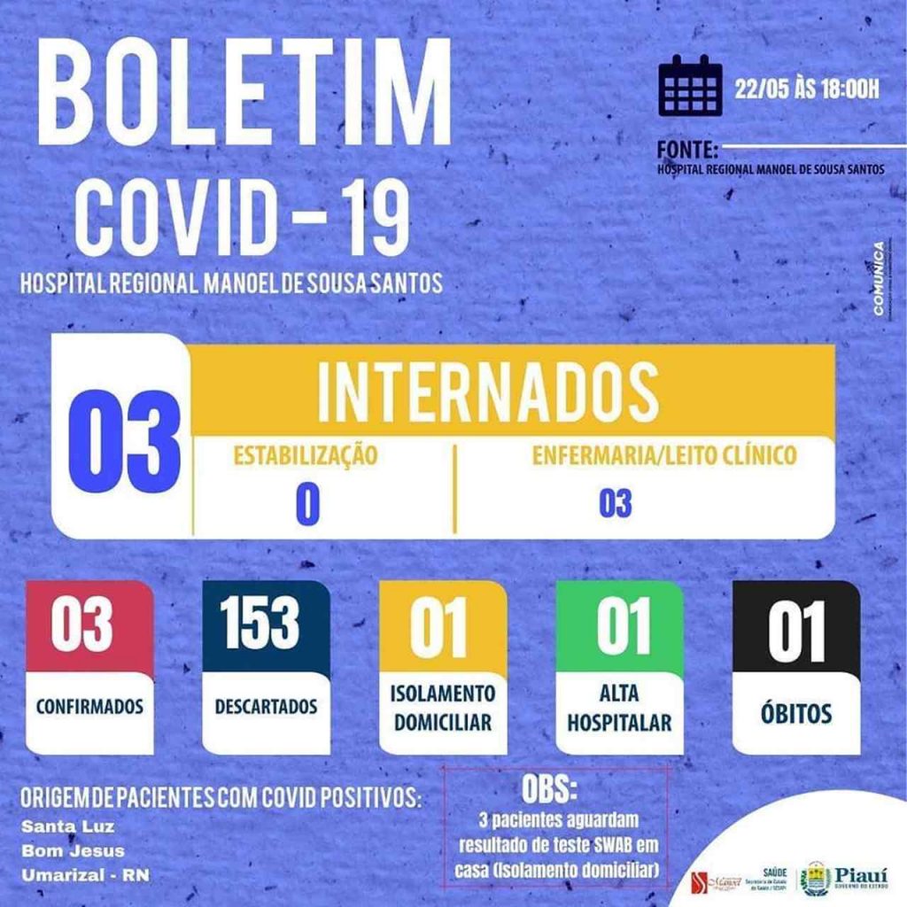Origem dos pacientes confirmados no hospital: Santa Luz Bom Jesus Umarizal (Rio Grande do Norte)Dos casos confirmados pela rede municipal de saúde, 13 pessoas estão recuperadas, Bom Jesus ainda não registrou nenhum óbito do novo coronavírus. Já os casos do hospital regional, 01 paciente recebeu alta.