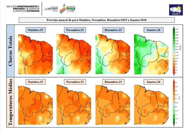 Em dezembro, o avanço das instabilidades deve aumentar os volumes: entre 200 e 230 milímetros no sul e até 160 milímetros nas regiões central e norte. O período chuvoso se consolida apenas em janeiro, quando as médias podem ultrapassar 260 milímetros em todo o Piauí.