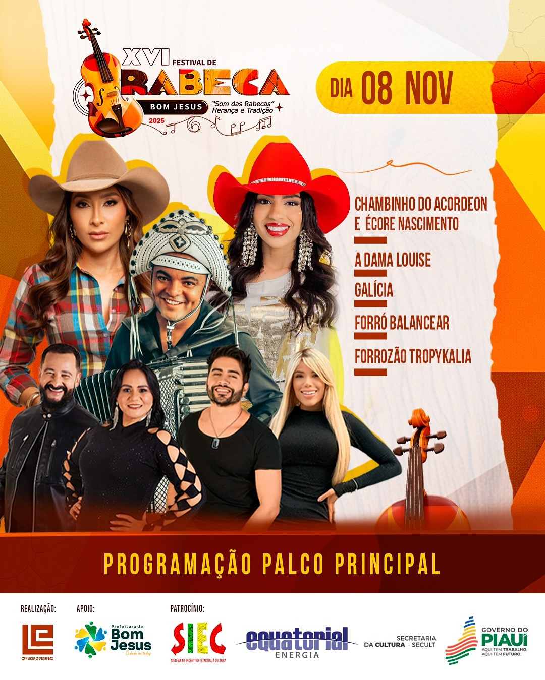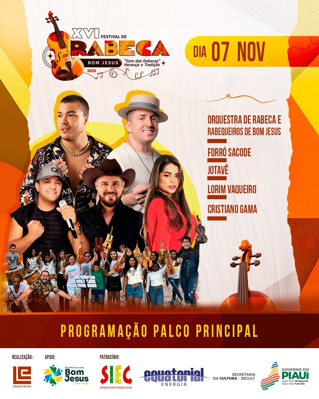 A cidade de Bom Jesus se prepara para viver mais uma grande celebração da cultura popular. A organização do Festival de Rabeca de Bom Jesus divulgou a programação oficial da 16ª edição do evento, que será realizada entre os dias 6 e 8 de novembro, com o tema “Som das Rabecas – Herança e Tradição”.