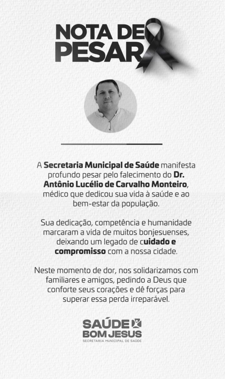A Secretaria Municipal de Saúde de Bom Jesus emitiu nota de pesar pela morte do médico, que atuava na rede pública de saúde e era muito querido pela comunidade local.