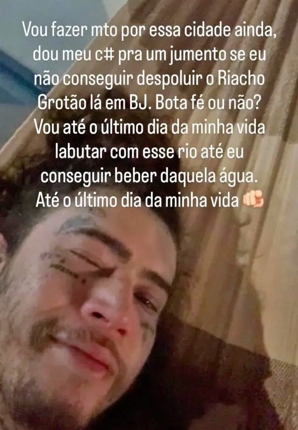 “Dou meu c# pra um jumento se eu não conseguir!”, brincou o humorista, completando logo em seguida, de forma séria e comprometida: “Vou até o último dia da minha vida pra conseguir beber daquela água.”