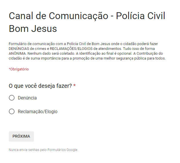 A Polícia Civil de Bom Jesus tem um canal de comunicação com você, cidadão, que queira fazer DENÚNCIAS de crimes e críticas/elogios de atendimentos dos policiais.